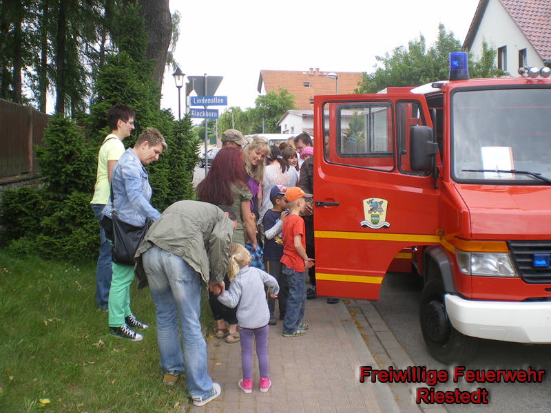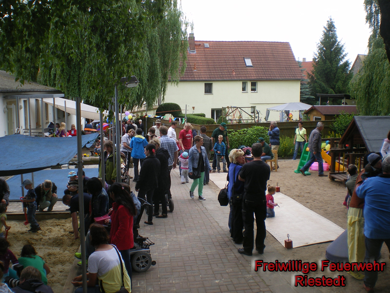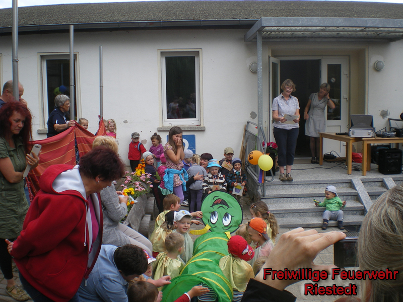 Wie in jedem Jahr, fand auch in diesem das traditionelle Familienfest im Kindergarten "Spatzennest" in Riestedt statt. Am Freitag, den 28.06.2013 konnten die Eltern bei schönem Wetter dem kleinen Programm, welches ihre Kinder gemeinsam mit den Erzieherinnen auf die Beine gestellt haben, anschauen. So zeigten die Kinder unter anderem die Geschichte der kleinen Raupe Nimmersatt. Auch von der Freiwilligen Feuerwehr Riestedt waren 3 Kameraden mit dabei. Nach dem Programm konnten die Kinder gemeinsam mit ihren Eltern das Fahrzeug bestaunen oder damit eine Runde mitfahren. Durch die Kita war auch ausreichend für das leibliche Wohl gesorgt, so konnte man sich mit einer Tasse Kaffee und einem Stückchen Kuchen oder mit Röster und Steak gemütlich hinsetzen.