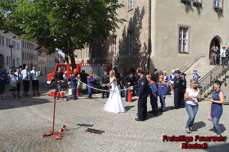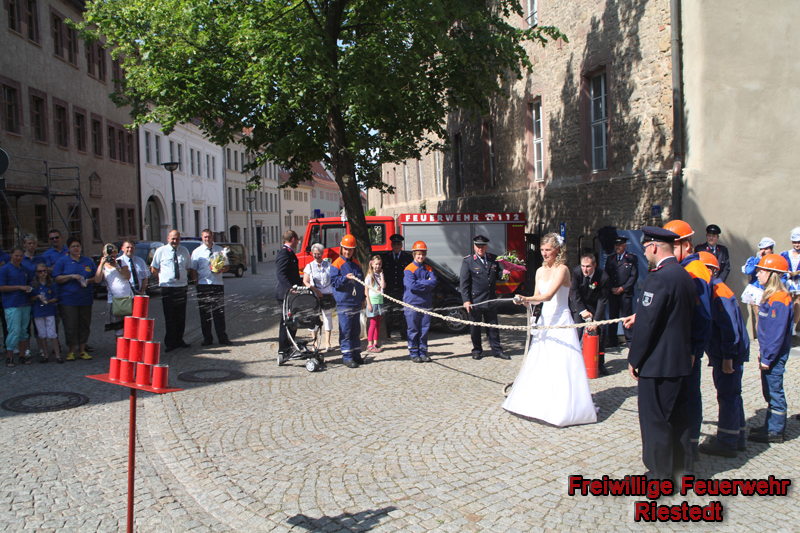 Am Samstag, den 13.07.2013 hatten unser Jugendwart Christian Klaube und seine Sabine den Bund der Ehe geschlossen. Nachdem die standesamtliche Trauung beendet war, wurden sie schon von unseren Kameraden, sowie von Mitgliedern unserer Jugendfeuerwehr und dem Riestedter Karneval Club (RKC) empfangen. Natürlich musste das frisch vermählte Paar noch ihr Können unter beweis stellen, so mussten sie gemeinsam mittels einer Kübelspritze 10 mit Sand befüllte Dosen aus einer gewissen Entfernung von einem Ständer abschießen.