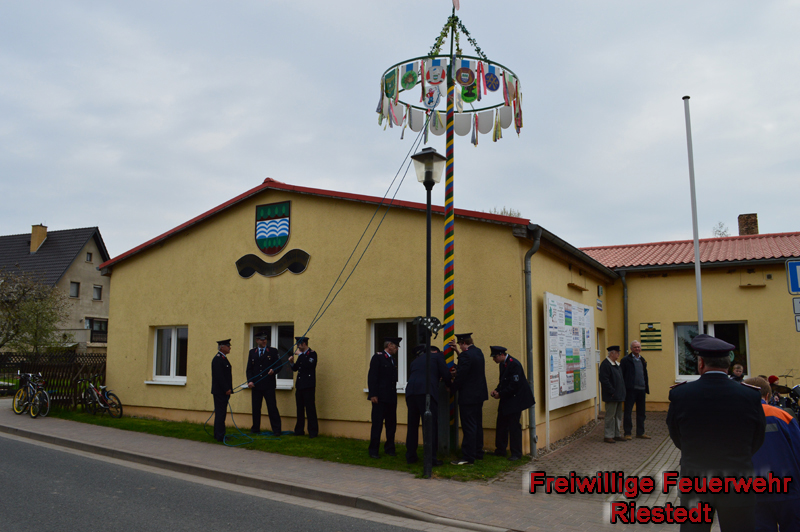 Nach der Rede des Ortsbürgermeisters stellten die Kameraden der Freiwilligen Feuerwehr Riestedt den Maibaum auf.