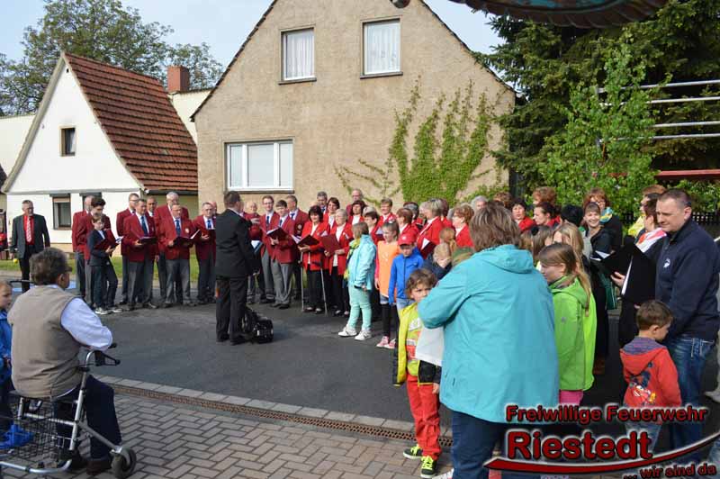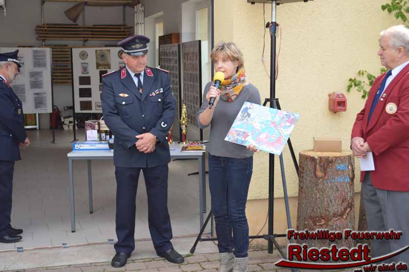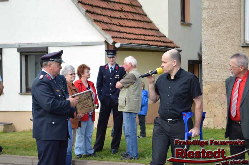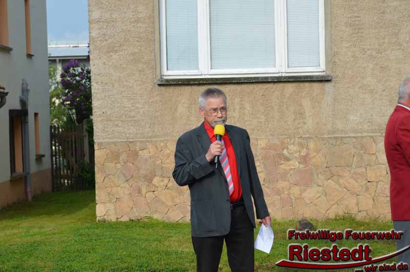 Pünktlich um 9 Uhr hat der Tag mit einem kleinen kulturellen Programm, durch die Chöre aus Riestedt sowie dem Riestedter Karnevals Club, begonnen. Neben ein paar begrüßenden Worten durch den Riestedter Ortsbürgermeister Herrn Schmidt, konnte man auch unseren Landrat Herrn Schatz begrüßen, welcher unserer Feuerwehr Dank und Anerkennung aussprach. Nachdem durch unsere Kameraden der Maibaum gesetzt wurde, ging es auch gleich mit einem großen Festumzug durch Riestedt weiter. Gegen 10:30 Uhr fand dann die offizielle Begrüßung durch unseren Wehrleiter statt. Auch Gäste wollten ein paar Worte loswerden und so wurden neben vielen Glückwünschen auch Geschenke überreicht sowie ein besonderes Geschenk, ein selbst gemaltes und gestaltetes Bild von den Kindern der Kindertagesstätte "Spatzennest", welches auch einen besonderen Platz bekommt.