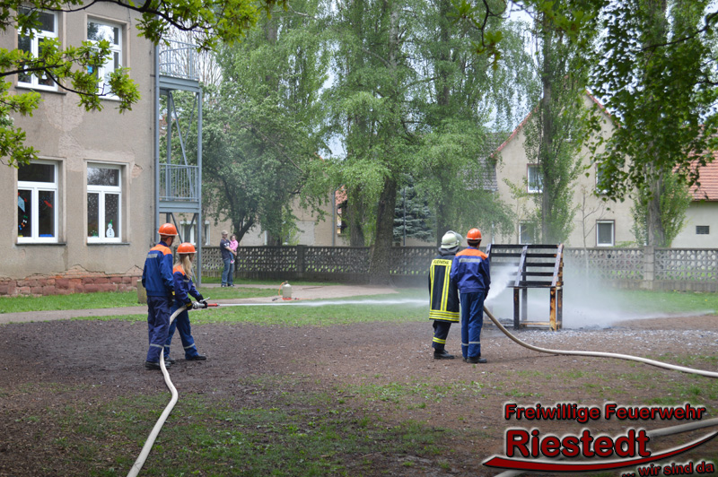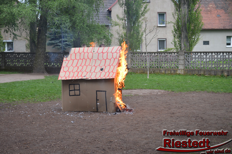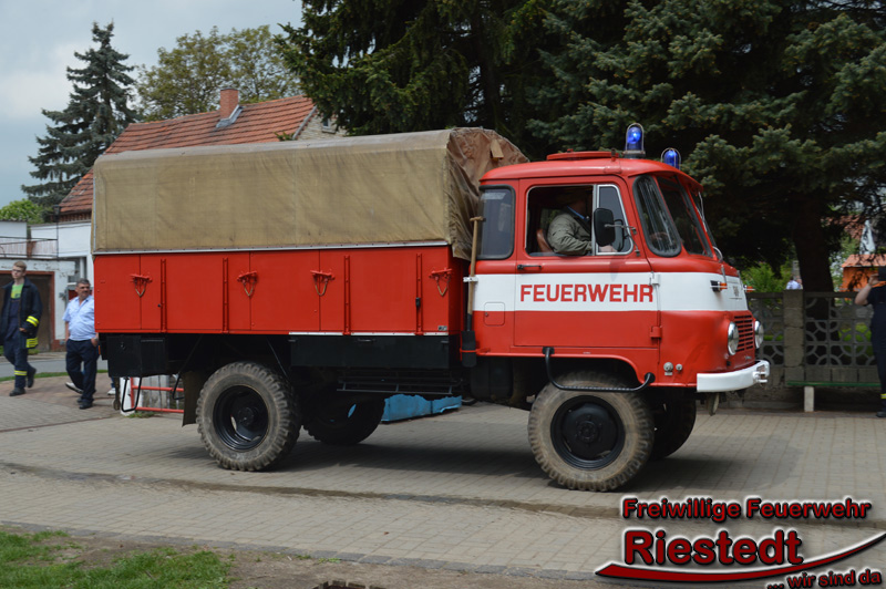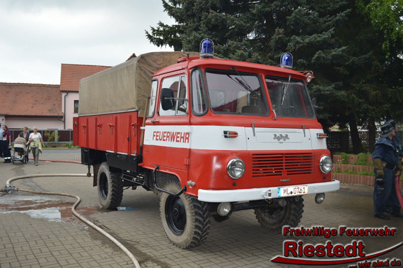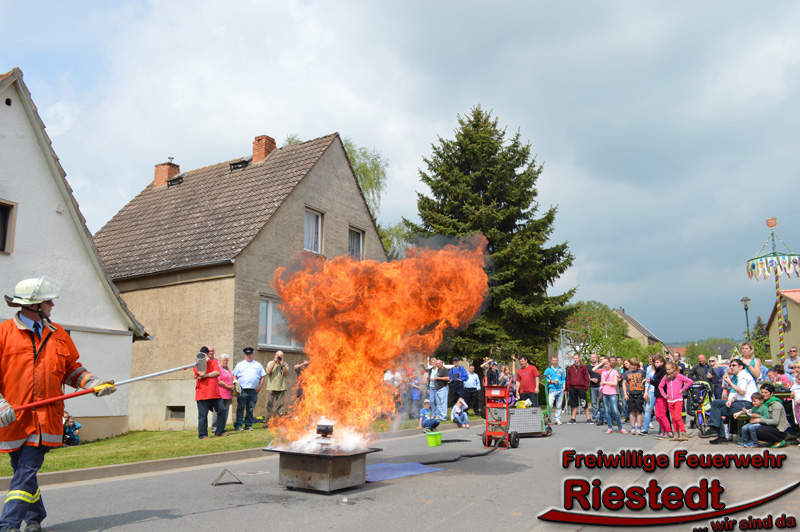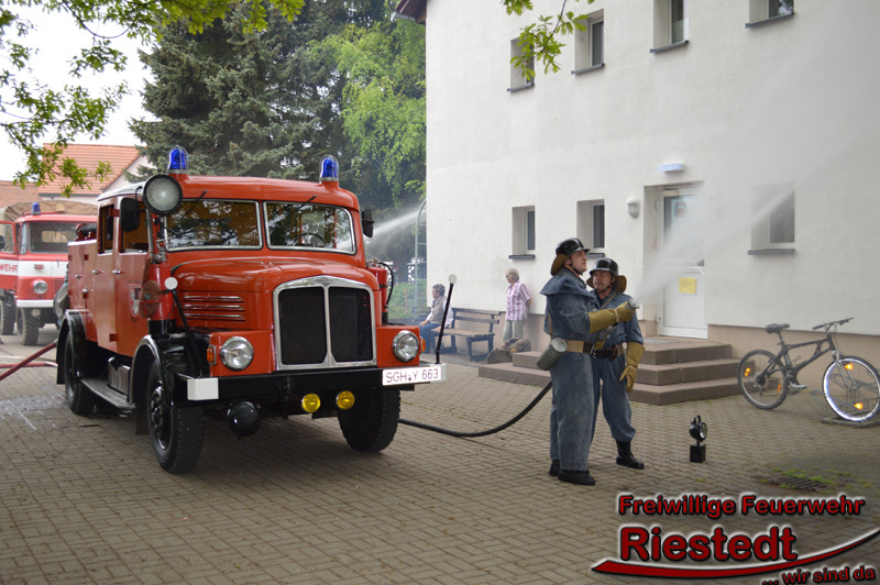 Durch einen Kameraden der Ortsfeuerwehr Sangerhausen konnten die Besucher hautnah erleben, wie gefährlich es ist, einen Fettbrand mit Wasser zur löschen und was mit einer Spraydose passiert, welche in einem Feuer liegt. Die Kameraden der Feuerwehr Allstedt sowie unsere Kameraden zeigten gegen Mittag eine Brandbekämpfung mit alter Technik. So rückten die Allstedter Kameraden mit ihrem alten Tanklöschfahrzeug an und die Besucher konnten unsere Kameraden mit dem alten Riestedter LO anrücken sehen. Neben der alten Technik waren die Kameraden beider Wehren auch wie früher angezogen. Nachdem der Einsatzleiter den Befehl "Feuer aus" geben konnte, war die Schauübung damit beendet und die Jugendfeuerwehr Riestedt zeigte ihr Können.
